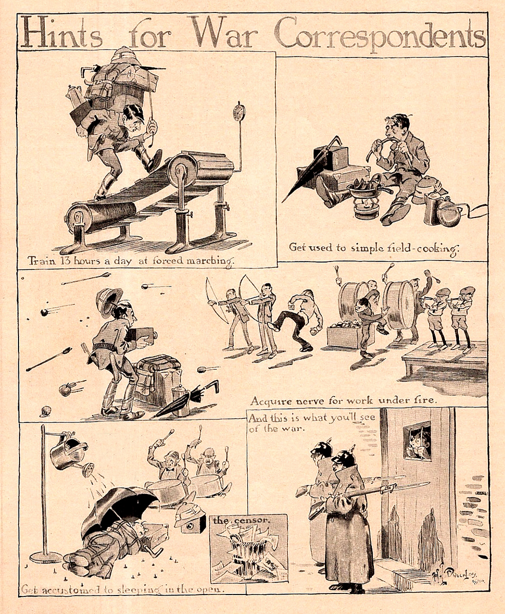 An important thing to note about both of Drucklieb’s Judge cartoons is his use of white space. Drucklieb didn’t feel the need to fill every square inch with pen work, though he certainly had the skills to do so. Drucklieb let the figures and objects do the majority of the talking for him. In the case of the Grantland Rice piece, Drucklieb allowed the drawings to work in conjunction with the text, so that one was not subservient to the other. Hints for War Correspondents shows a masterful ability at both body language and changing angles, as Drucklieb appears to effortlessly turn scenes while maintaining a sparseness in the spaces.